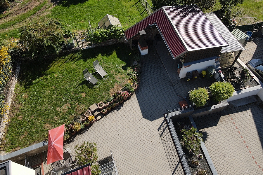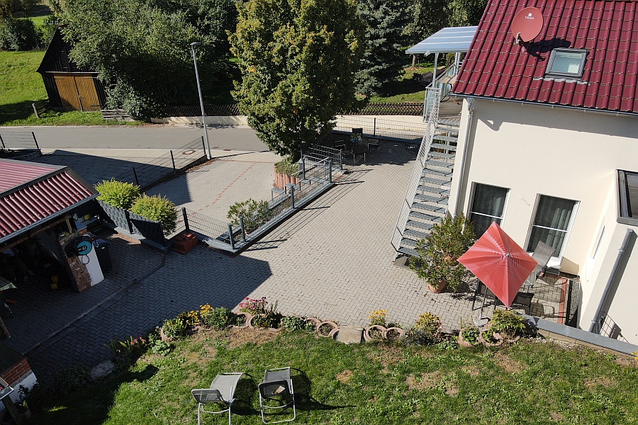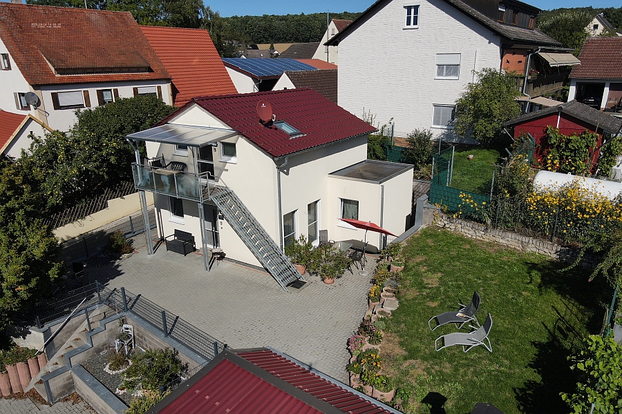 Blick über den Wohnbereich aus Richtung Küche in der DG Wohnung Blick in den Wohn- und Essbereich der EG Wohnung Blick auf den überdachten Grill- und Sonnenbereich Blick vom Parkplatz auf das Ferienhaus und die Sonnenterrasse Blick in den Garten Blick auf das Ferienhaus und die Sonnenterrasse Blick von oben auf das Ferienhaus