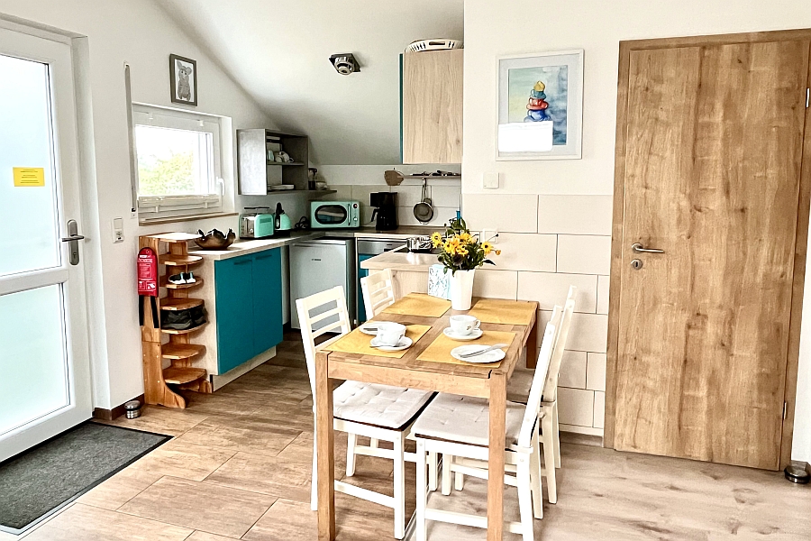 Ferienwohnung im Erdgeschoss für 4-5 Personen mit Du/WC, Wohnküche, Schlafraum mit Doppelbett (kann bei Bedarf auch einzeln gestellt werden), Schlafraum mit Etagenbett, Schlafsessel und Terrasse.