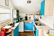 Ferienwohnung im Dachgeschoss für 4 Personen mit Du/WC, Küche, Wohn/Esszimmer, Schlafraum mit zwei Einzelbetten, Schlafraum mit Doppelbett (kann bei Bedarf auch einzeln gestellt werden) und Balkon.